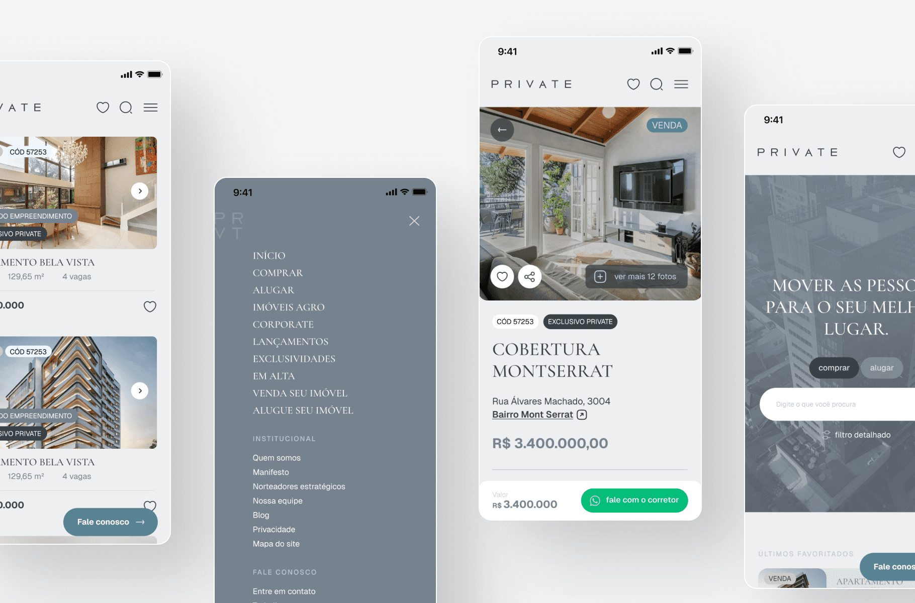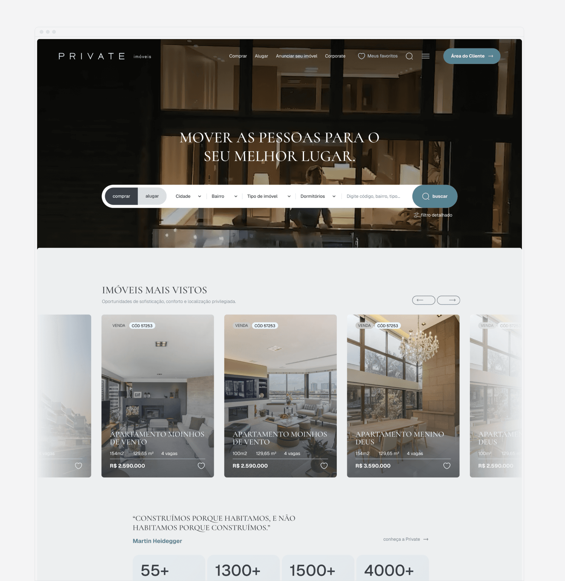 The main challenge was to balance an elegant and refined visual language with a functional and intuitive experience. It was essential to showcase the properties through strong visual presentation while maintaining usability, as well as organizing a large amount of information in a clear and fluid way for different user profiles. The final result is a website that strengthens Private Imóveis’ position as a reference in the high-end real estate market. With clean layouts, well-defined visual hierarchy, and intuitive navigation, the platform delivers a sophisticated and efficient experience — making property discovery seamless and reinforcing the brand’s perceived value.