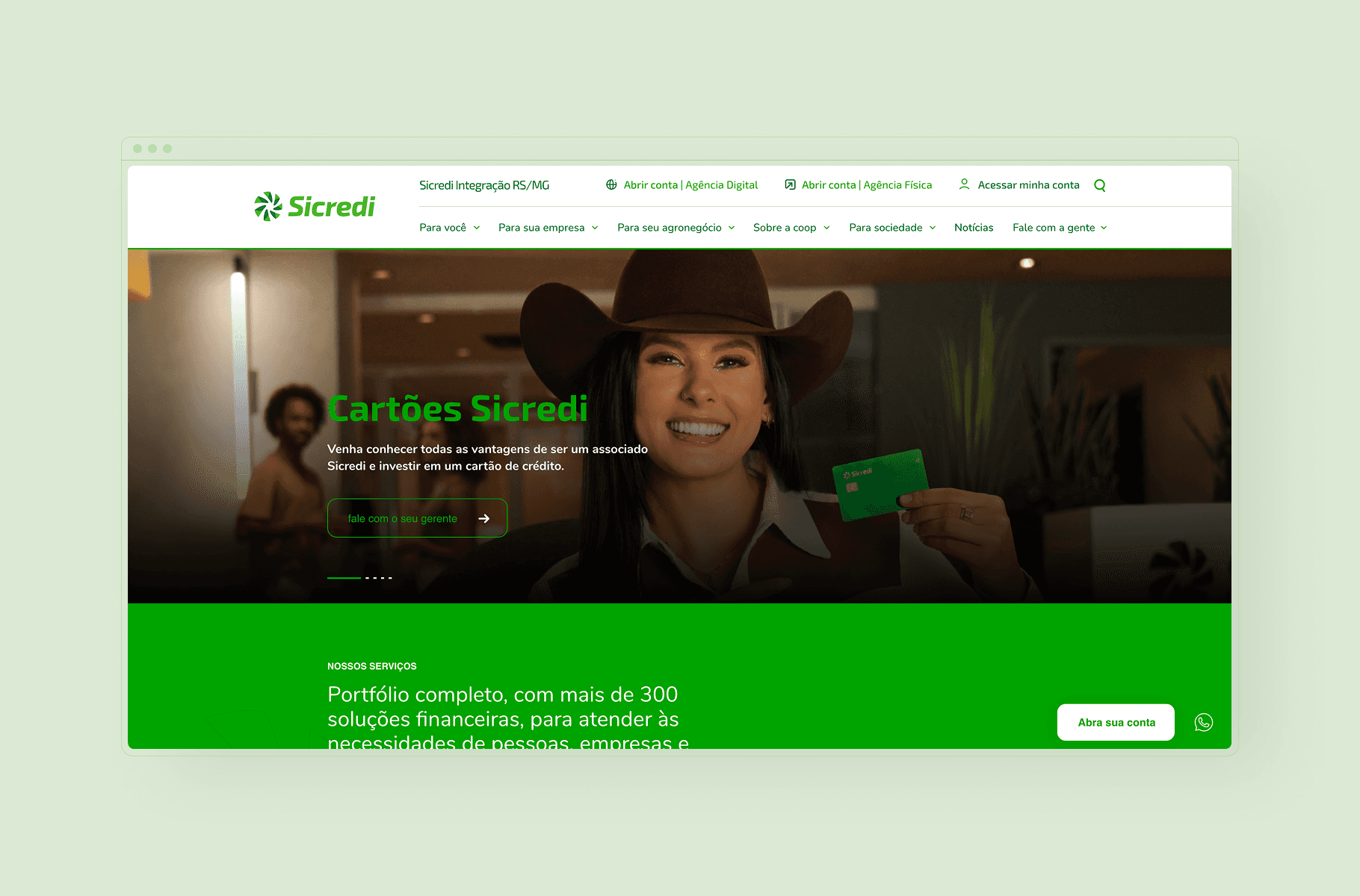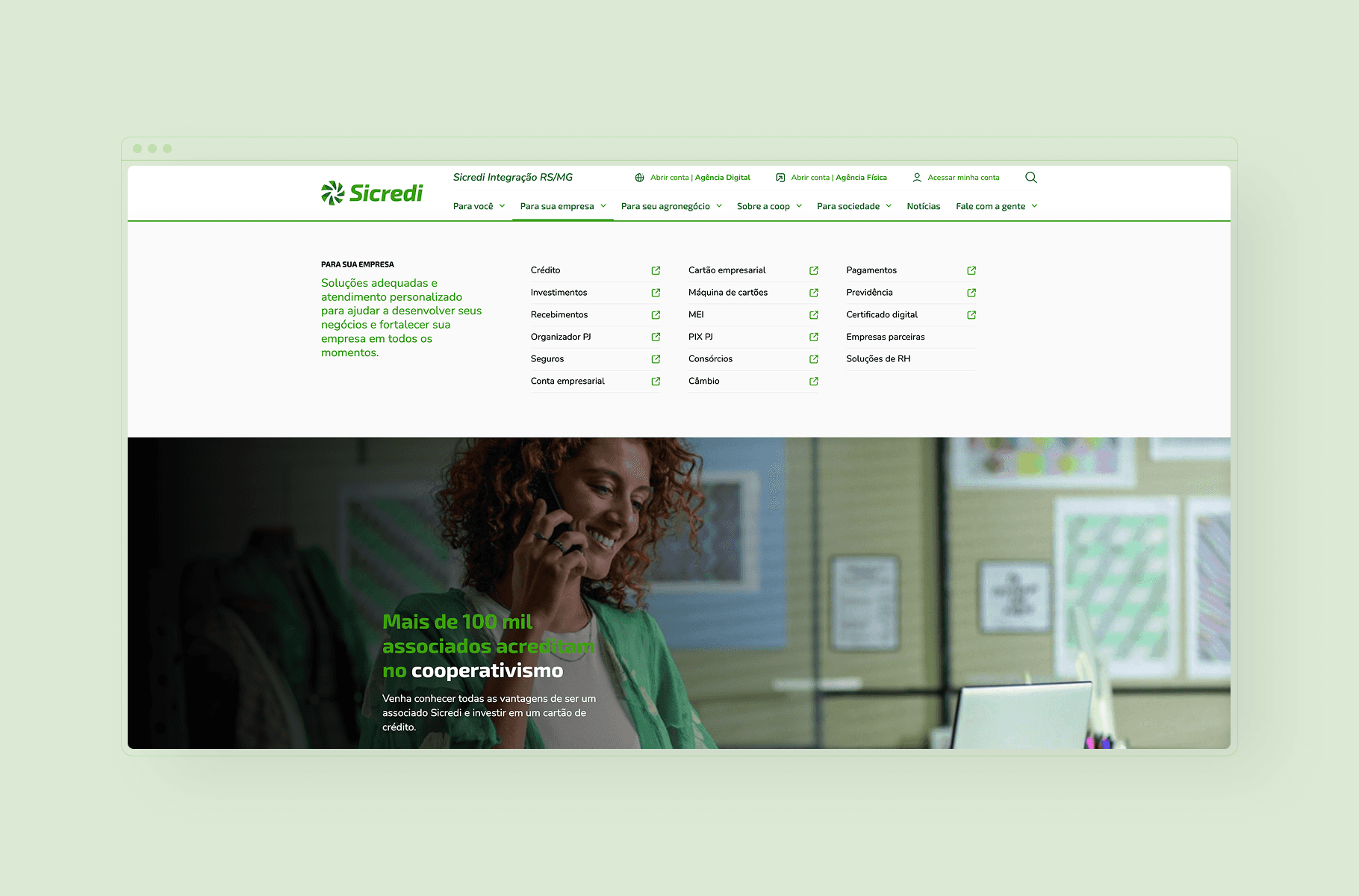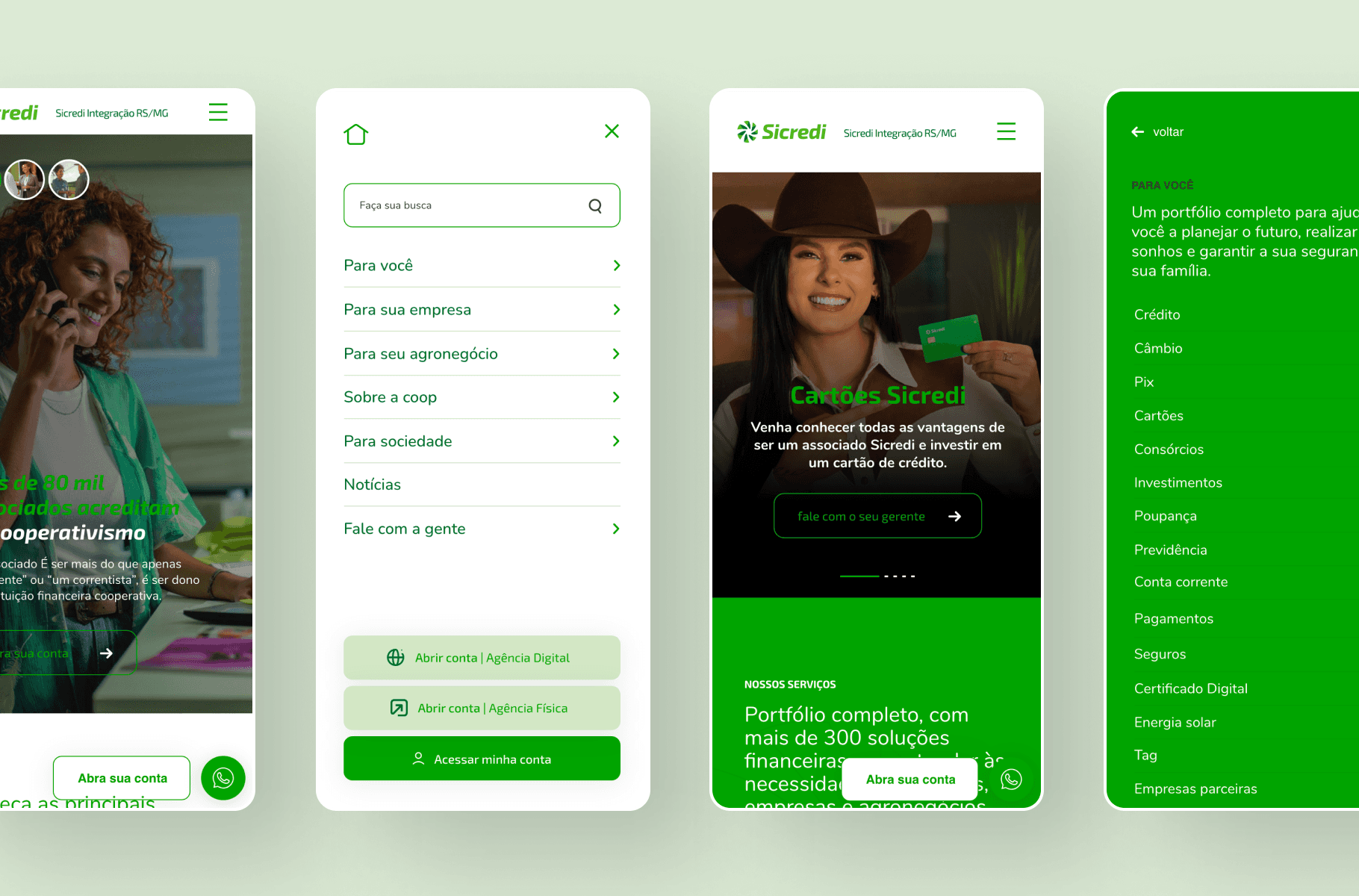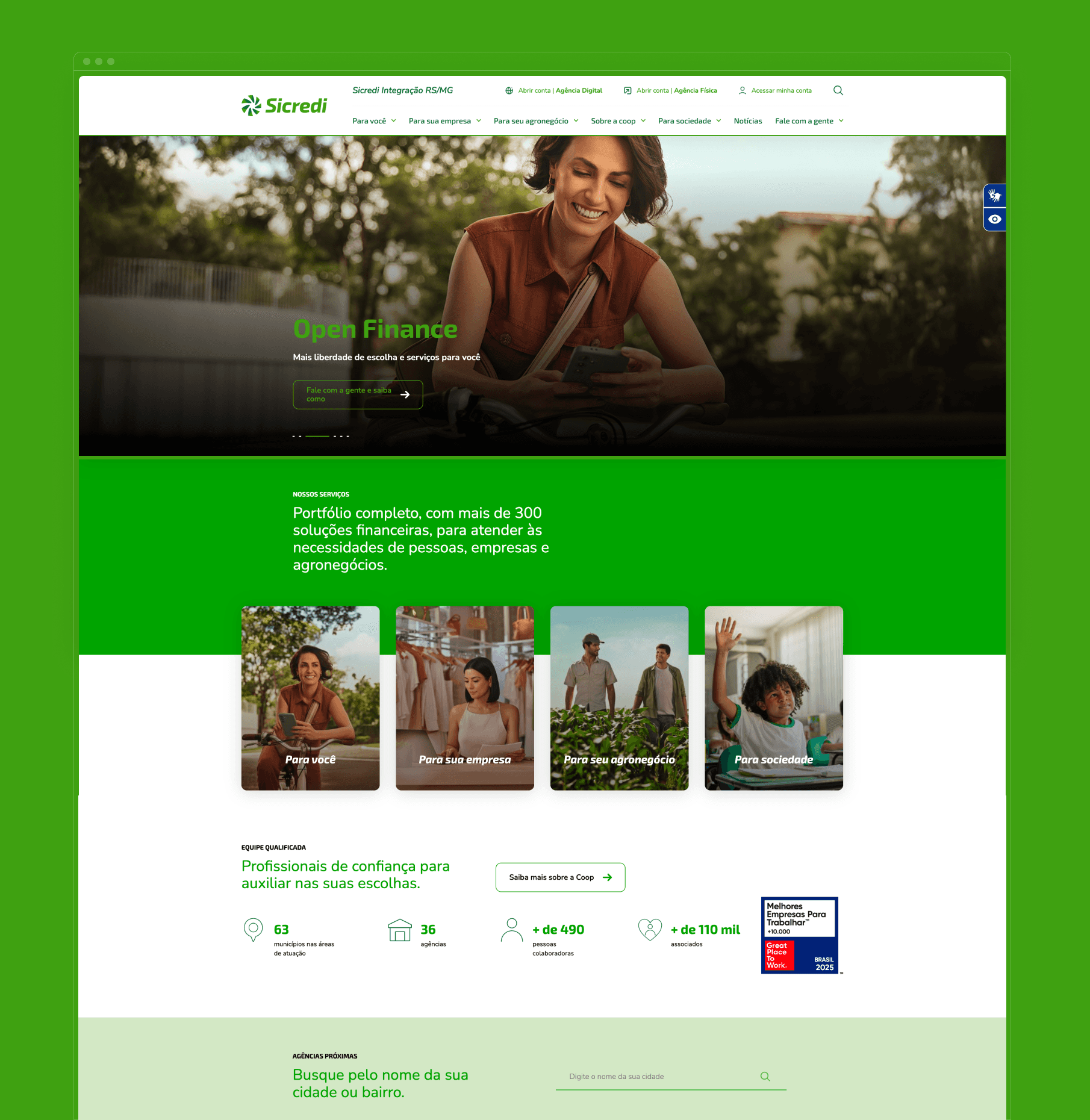 Develop an institutional page to clearly and effectively showcase all the financial solutions offered by Sicredi Integração. The main challenge was to design an intuitive and welcoming experience that reflects the principles of cooperativism — closeness, transparency, and collaboration — without replicating the layout of a traditional banking website. The visual approach aimed to balance modernity and simplicity, making it easy for users to understand how the cooperative can support their personal and business finances.